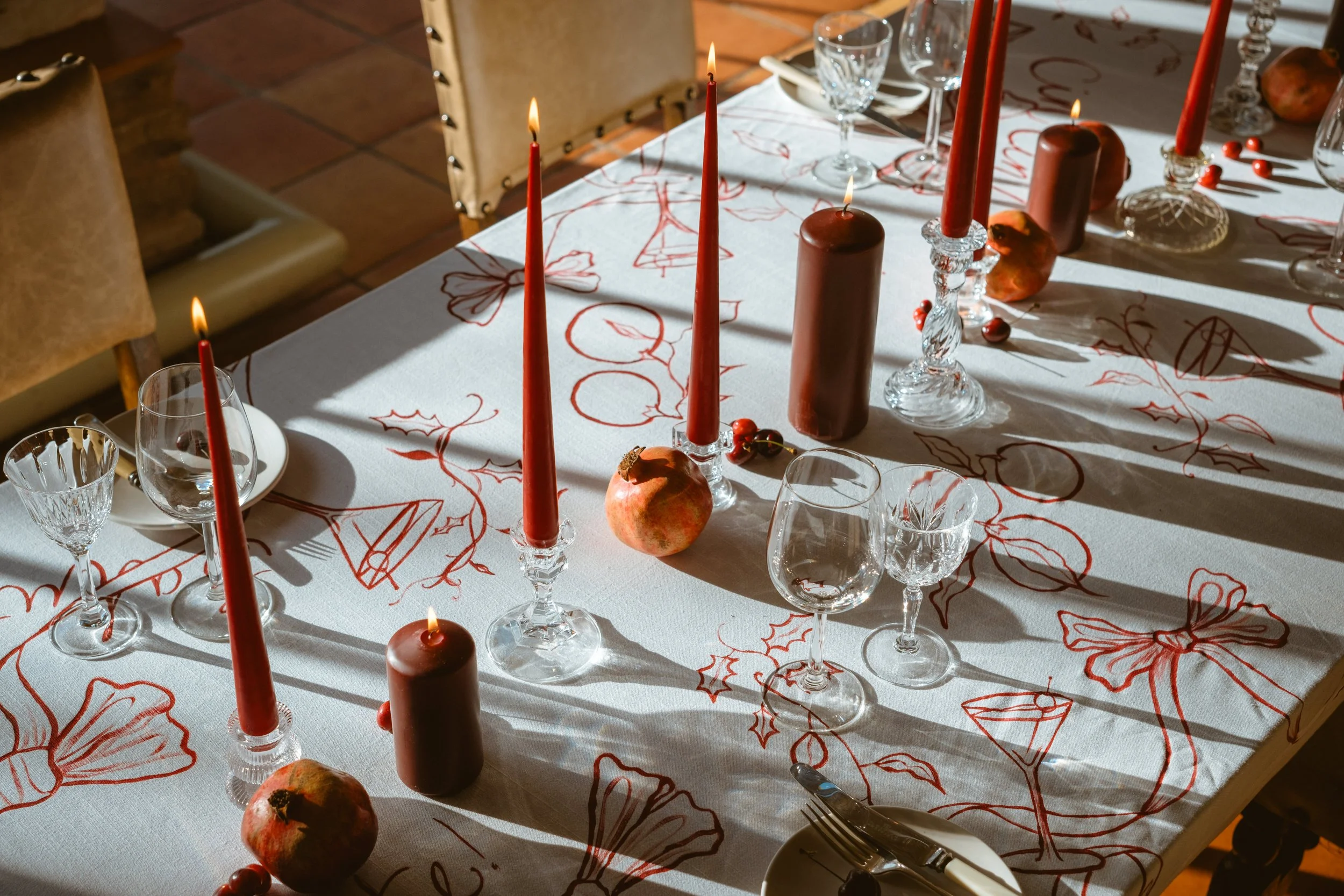 Let’s choose beauty on purpose. A painted table cloth that turns a dinner into an event. Menu’s too pretty to throw away. A hand-painted, original motif that becomes a brands elevating signature.